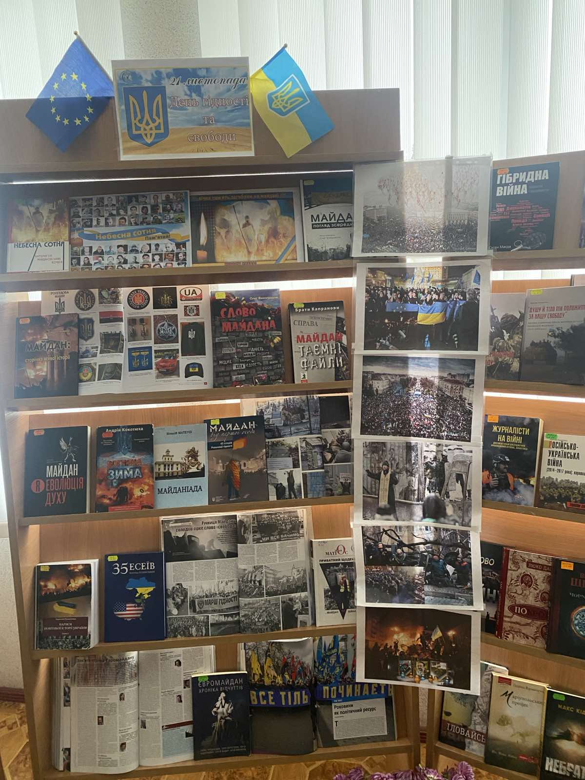 Також у читальному залі суспільних наук школярі ознайомилися з тематичною книжковою виставкою, присвяченою Дню Гідності та Свободи. Представлені видання допомогли учням глибше усвідомити події, які формують національну пам’ять і сучасну історію України.