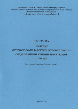 Психолого-педагогічні основи роботи з обдарованими учнями початкової школи : програма спецкурсу / розроб. Л. С. Мерва. — Тернопіль : "Джура", 2013. — 16 с. "Психолого-педагогічні основи роботи з обдарованими учнями початкової школи" це спецкурс за вибором для студентів відділення "Початкова освіта". |