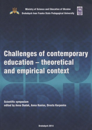 Challenges of contemporary education - theoretical and empirical contexts: Scientific symposium / Edited by Anna Dudak, Anna Kanios, Oresta Karpenko. – Drohobych: publishing department of Drohobych Ivan Franko State Pedagogical University, 2014. –178 p. – ISBN 978-966-384-309-4 The scientific symposium highlighted development perspectives of modern education, the role of the pedagogue in character formation and teaching of younger generations. Its content focused on renewal directions and character formation that in Poland used innovative upbringing methods. |